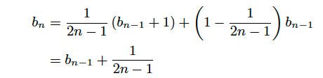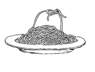 Let us denote bn as the average number of loops that the young man creates with a plate of n spaghetti. Thus, b1 = 1, and we seek b100. Let us consider a plate of spaghetti with n 2. For his first knot, the young man either ties a spaghetti to itself or the two spaghetti to each other. In the first case, the spaghetti is eliminated: there will be on average bn−1 + 1 loops. In the second case, everything happens as if the plate only had n-1 spaghetti on it: there will be on average bn−1 loops. The probability that the first spaghetti tied formed a loop is 1/(2n−1): indeed the young man chose